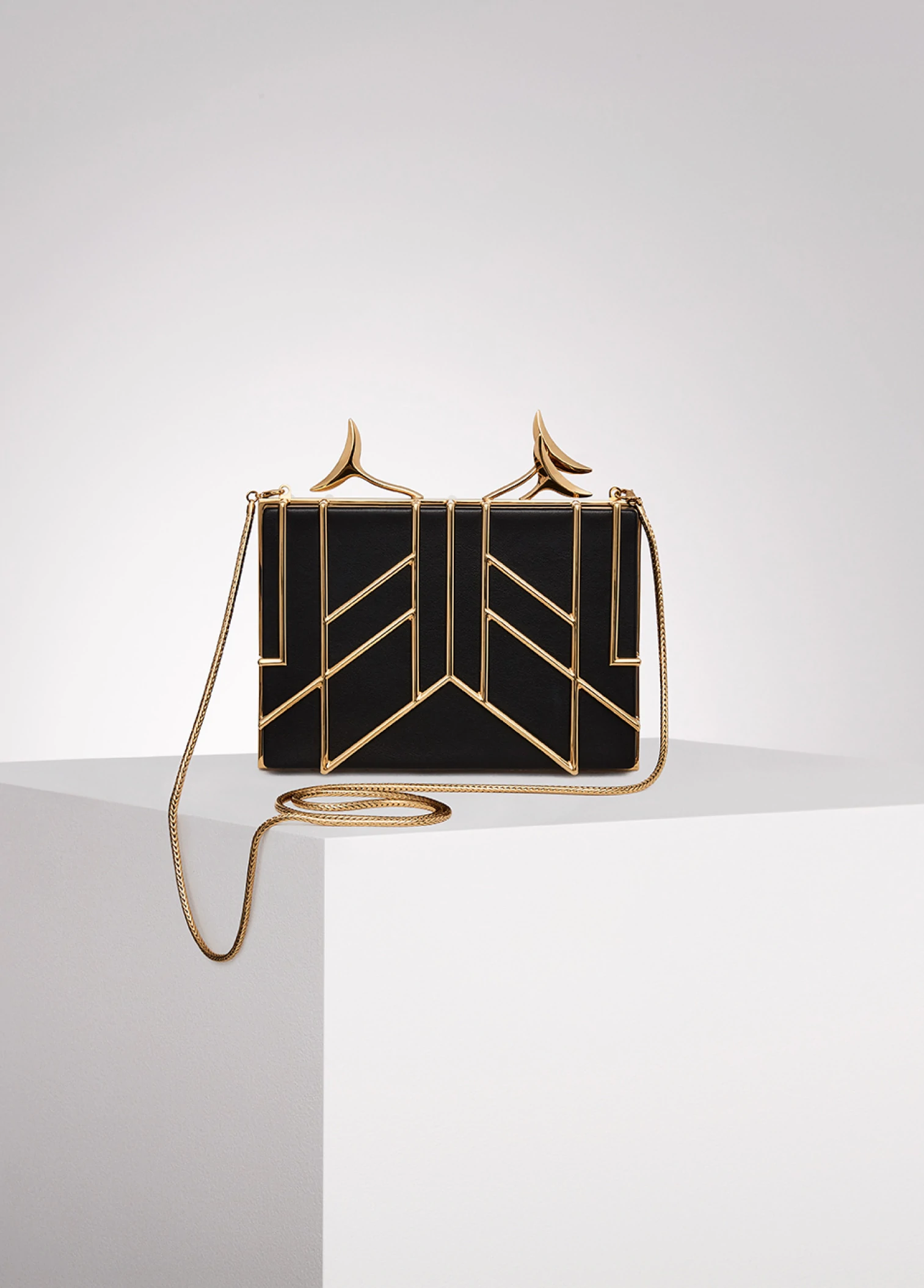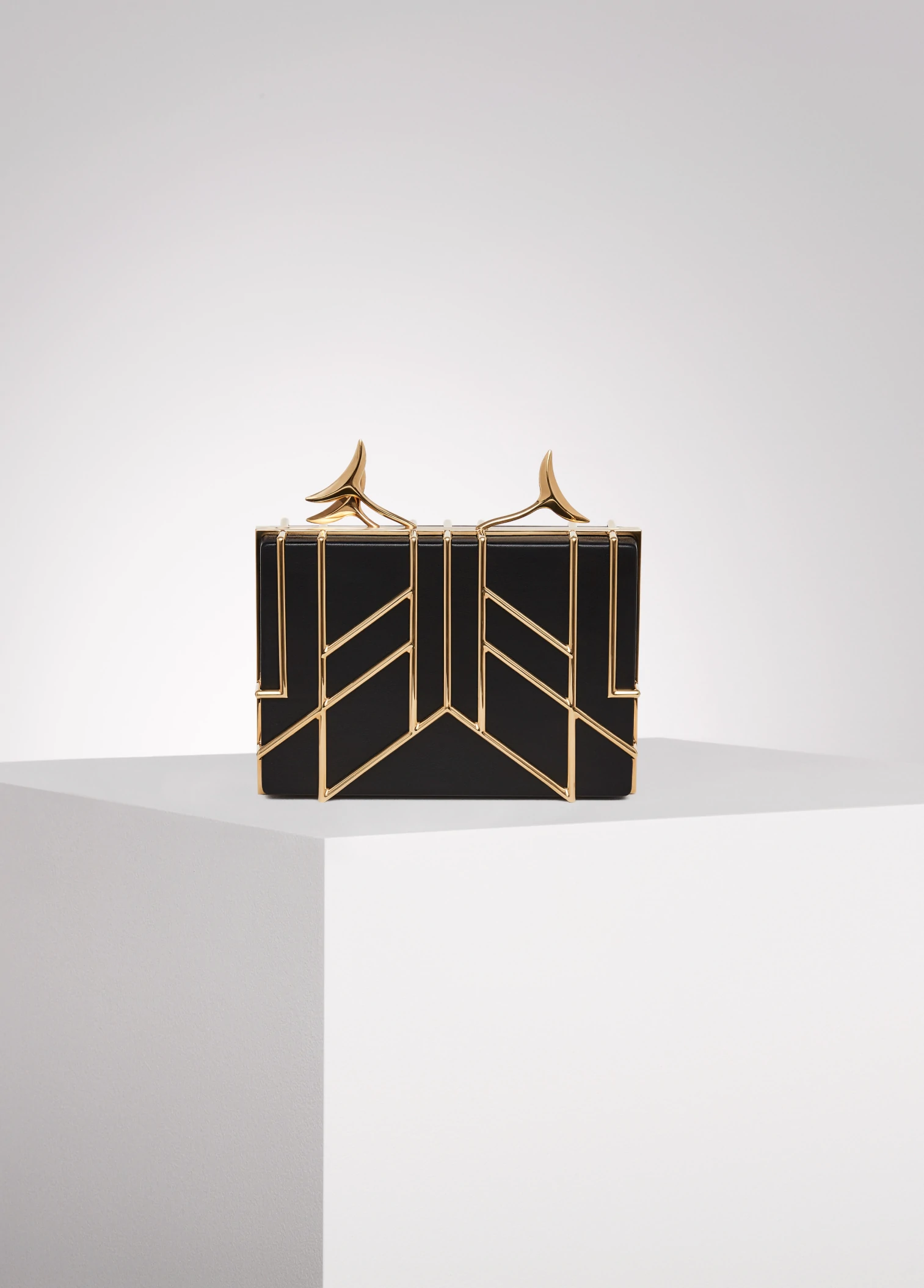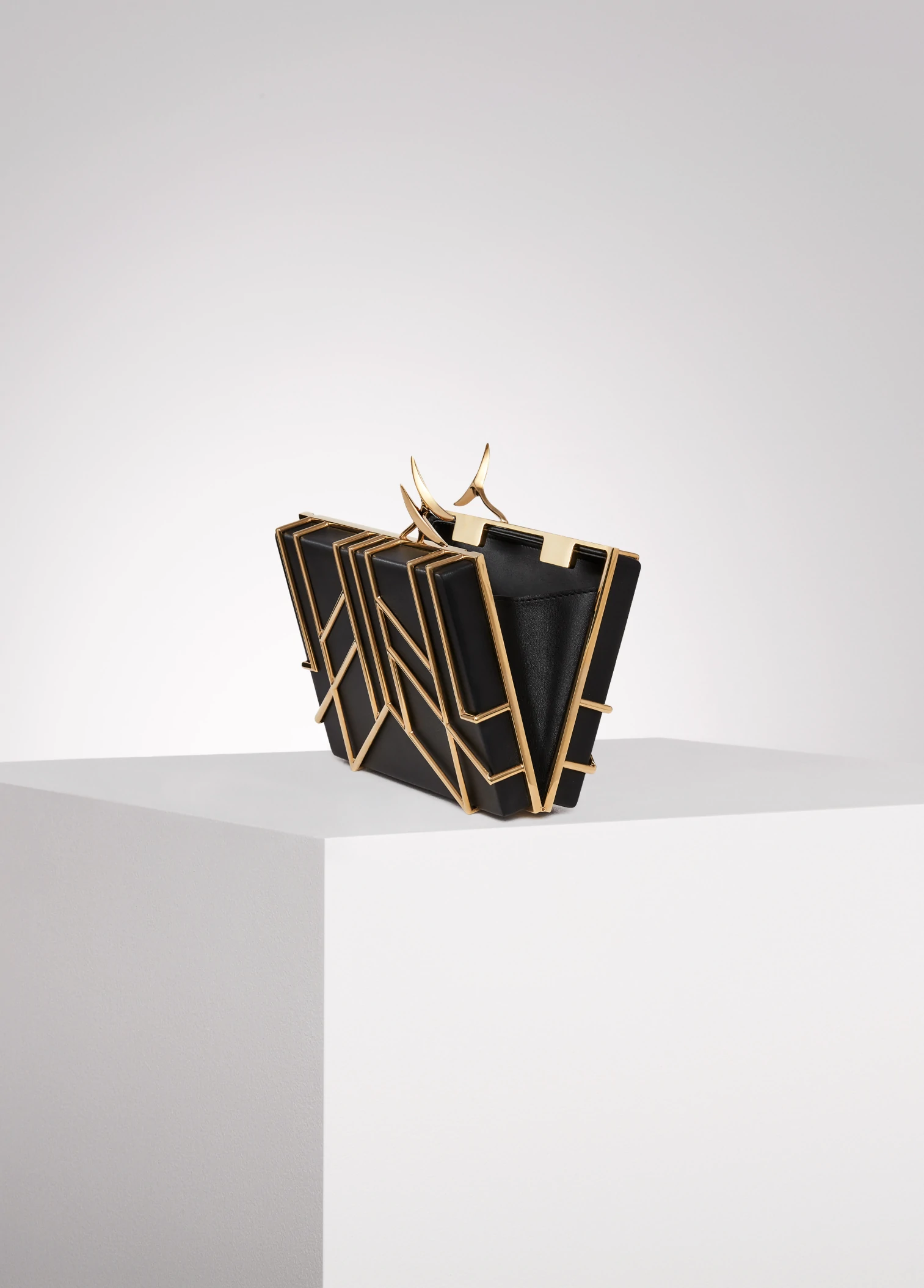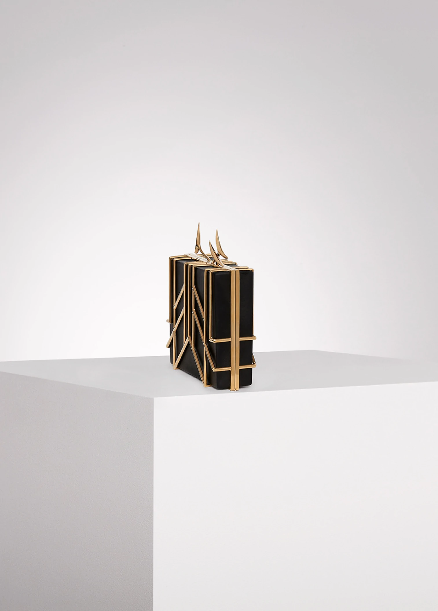 Crafted in smooth black lambskin and enhanced by a 24k gold-plated “Broche and feathers” cage. Created at first as a sculpture to become a bag after. Symbolic peacock's feathers spring from the top and gracefully enlacing a hand. Unique number engraved inside.
