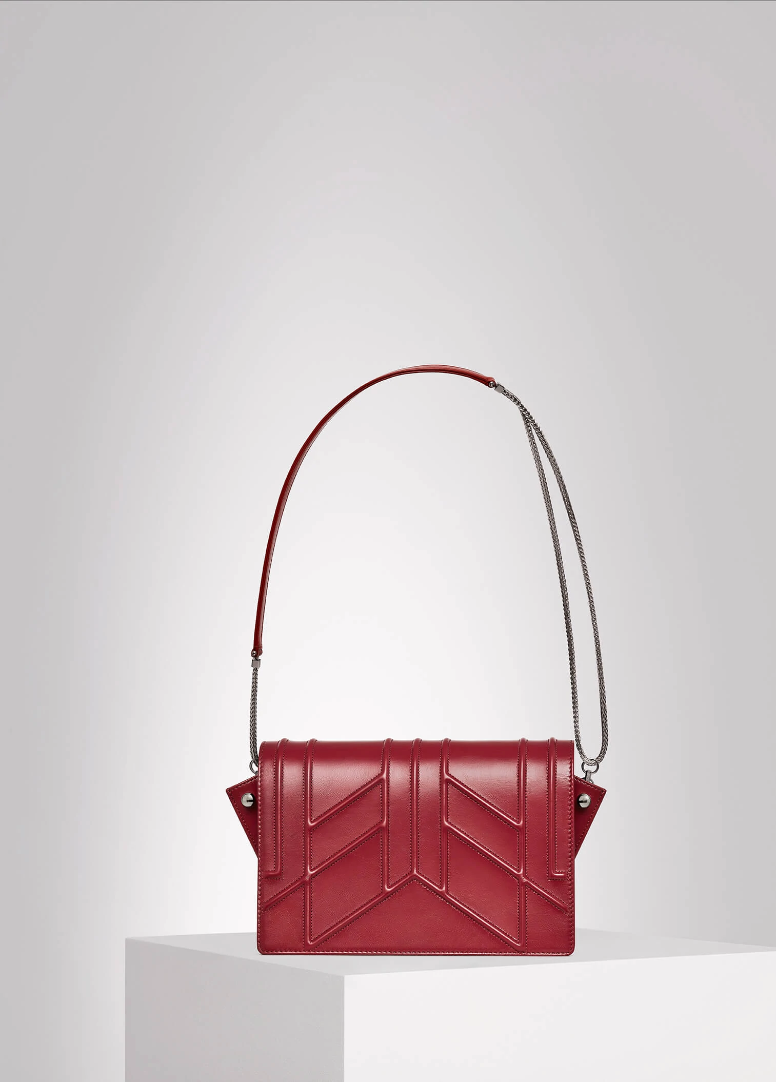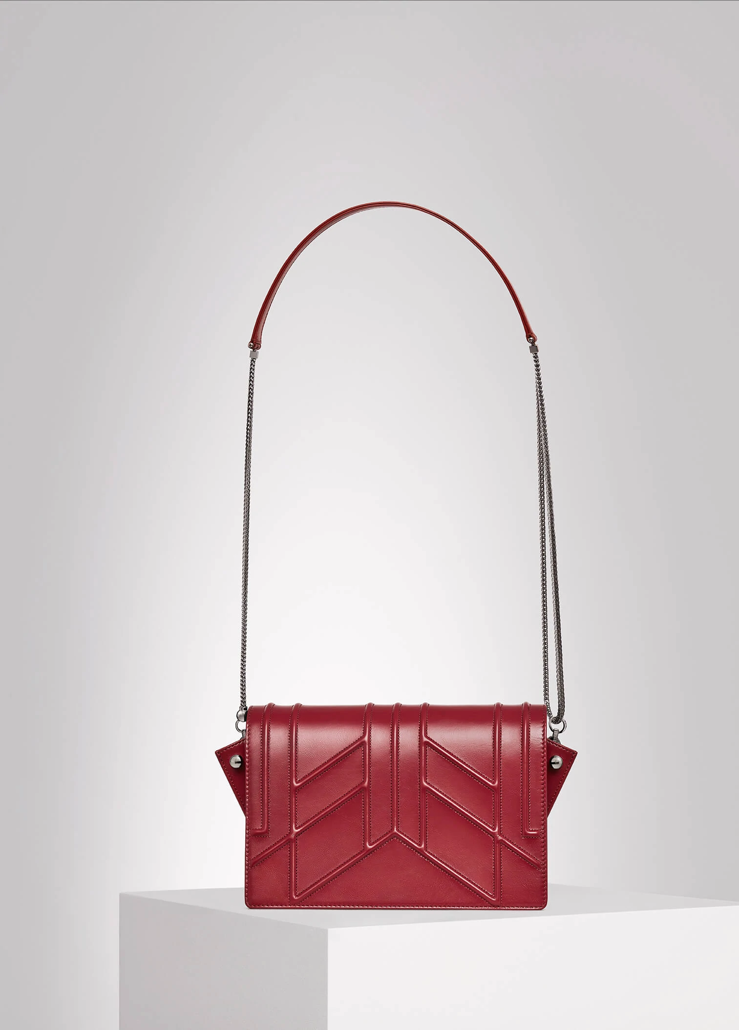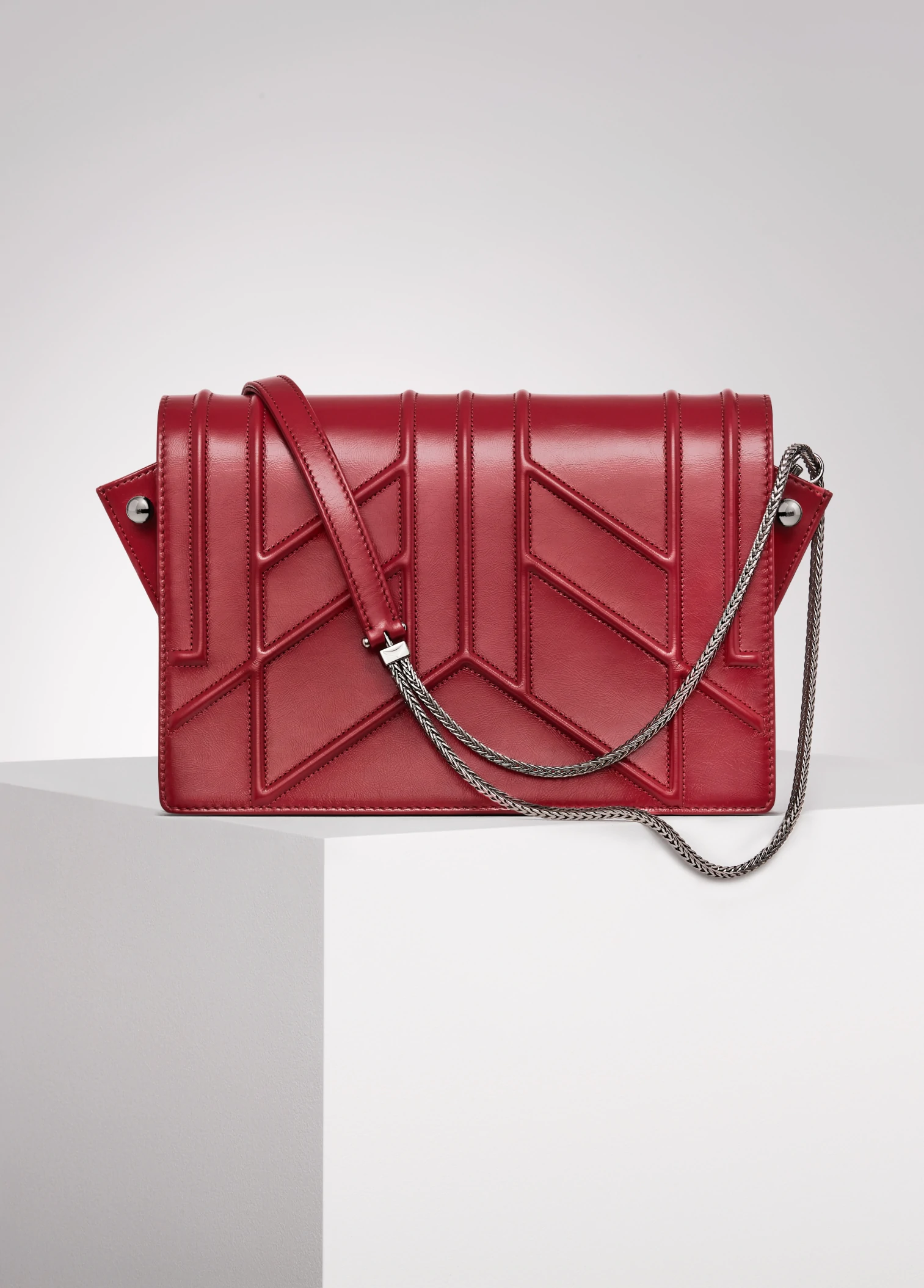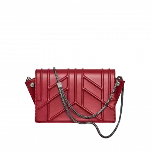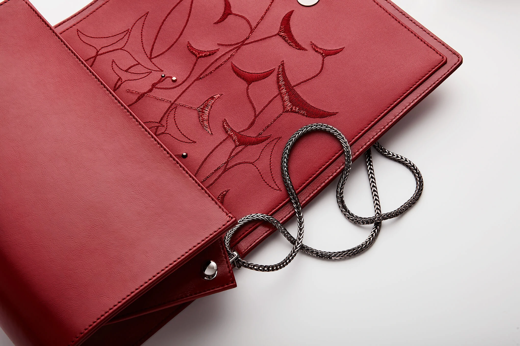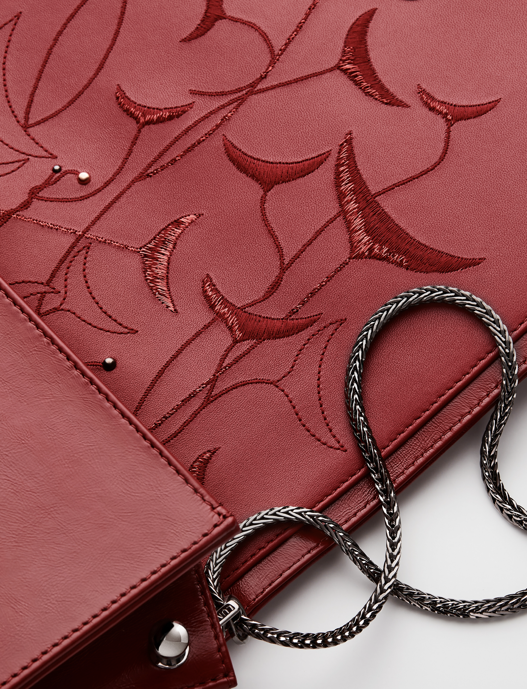 embroideries, red calfskin, red lambskin, dark silver-tone brass chain