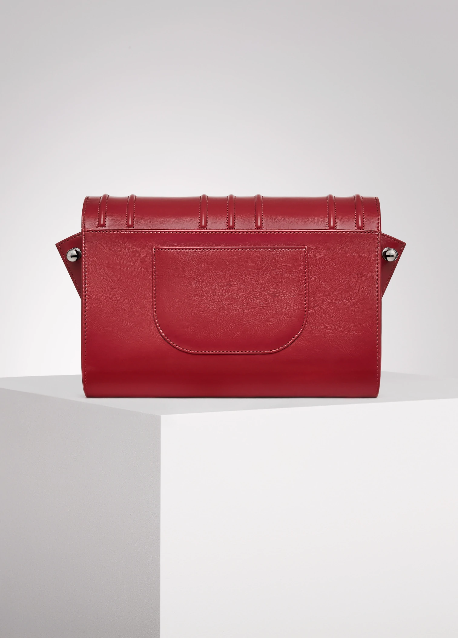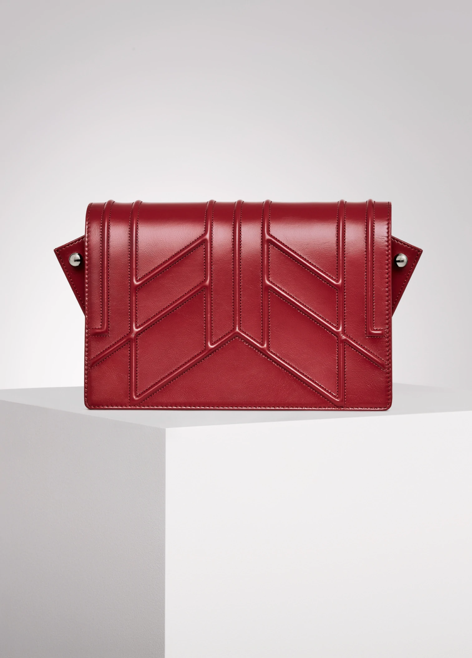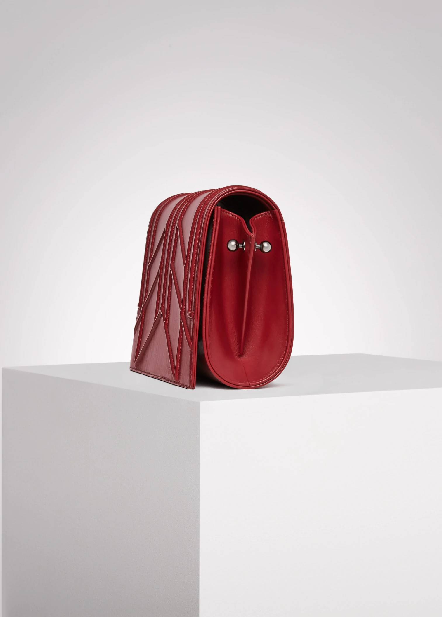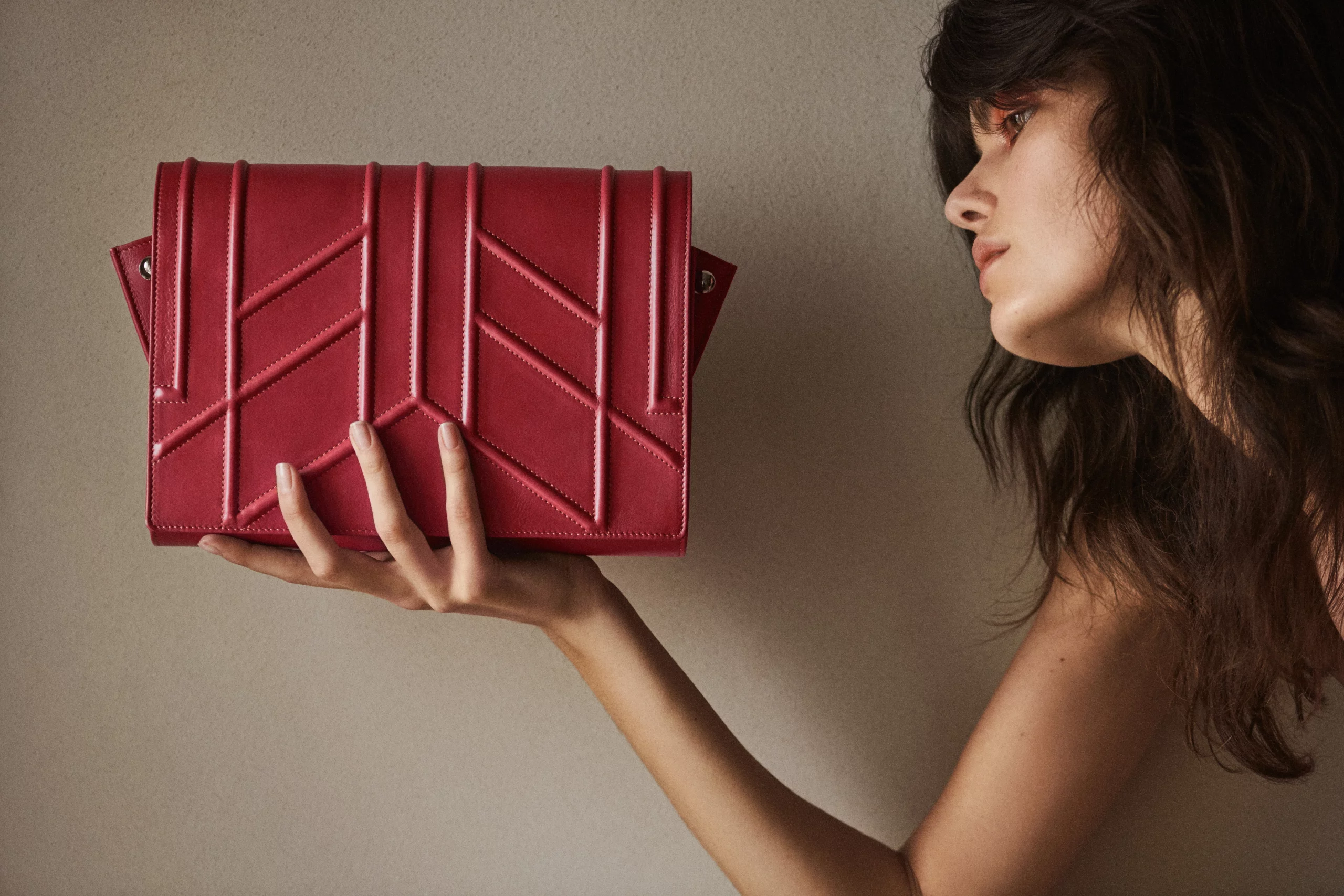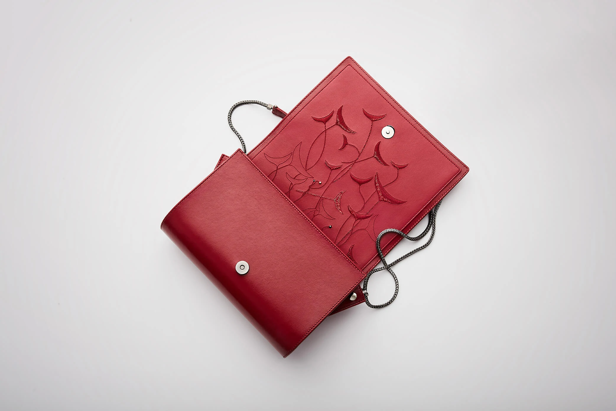 "Broche" embroidery embossed on red, calfskin leather in the front. "Feathers" red embroidery, layered and monochromatic, created on red lambskin placed inside the bag. Interpretation of feathers moving like reeds in the wind, and enlaced by wild roses subtly enhanced by dark silver and gold studs. Each work has unique number engraved inside.