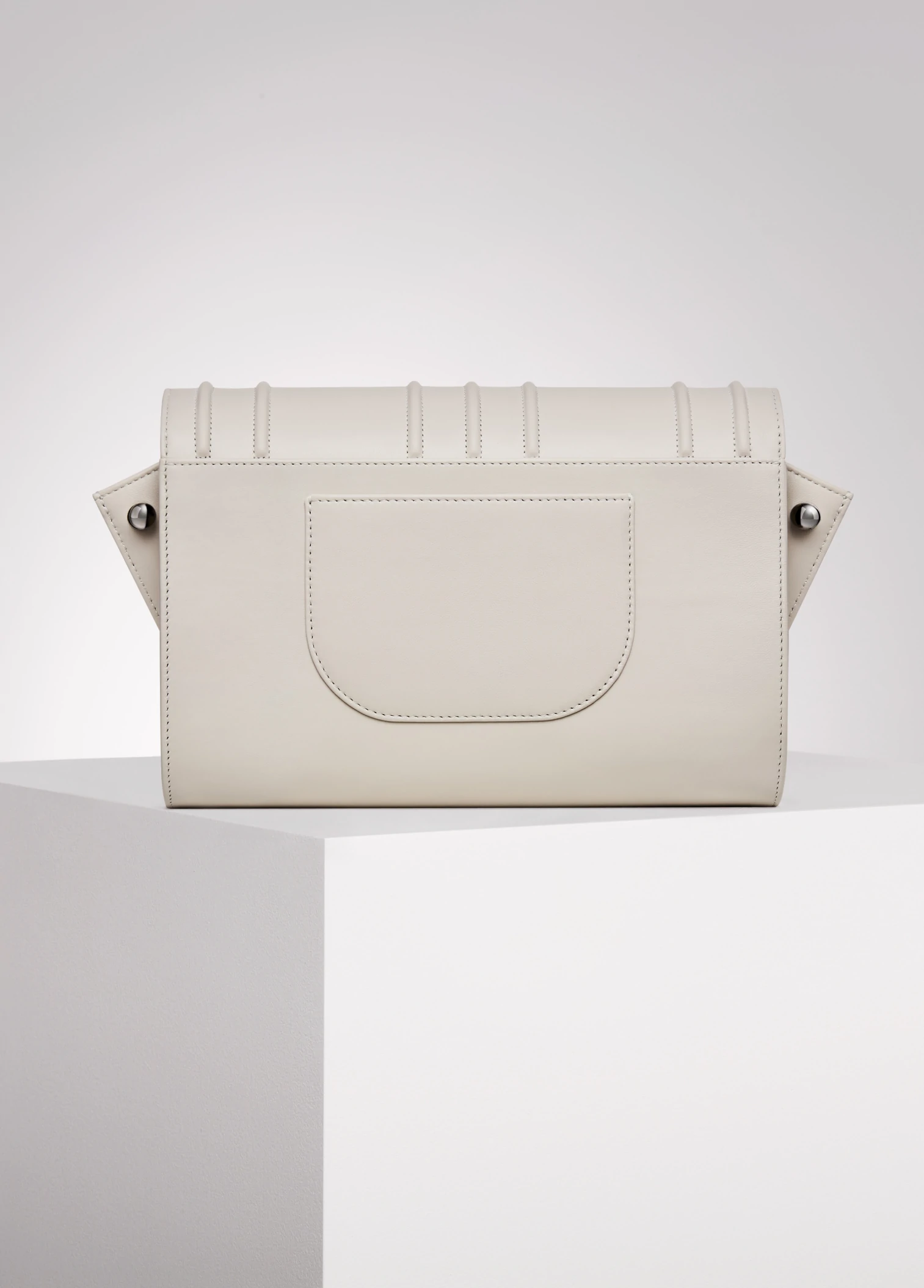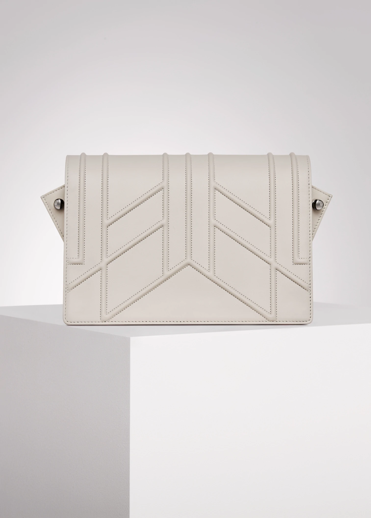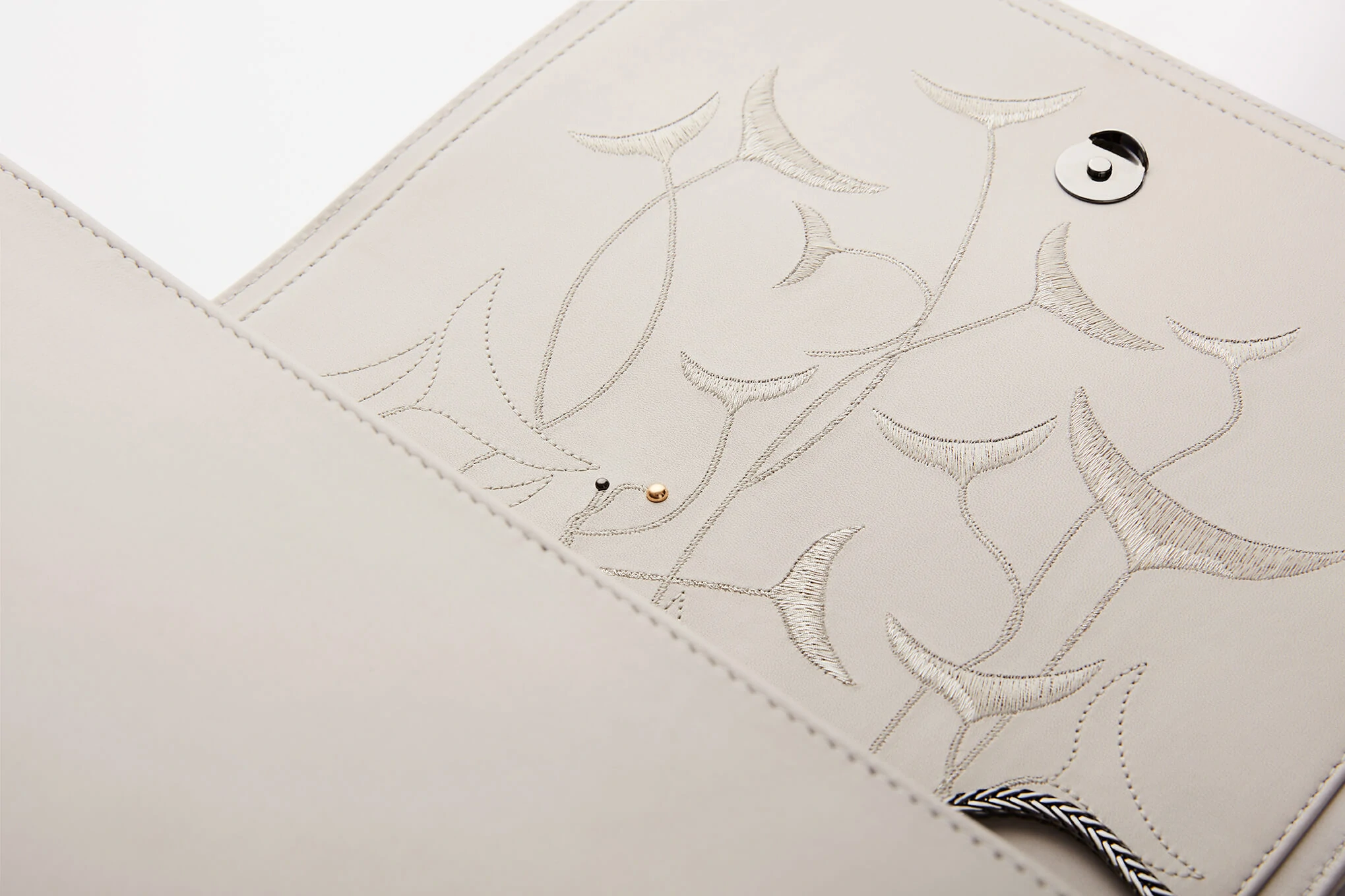"Broche" embroidery embossed on the front. "Feathers" layered and monochromatic embroidery created on a leather placed inside the bag. Interpretation of feathers moving like reeds in the wind, and enlaced by wild roses subtly enhanced by dark silver and gold studs. Each work has unique number engraved inside.