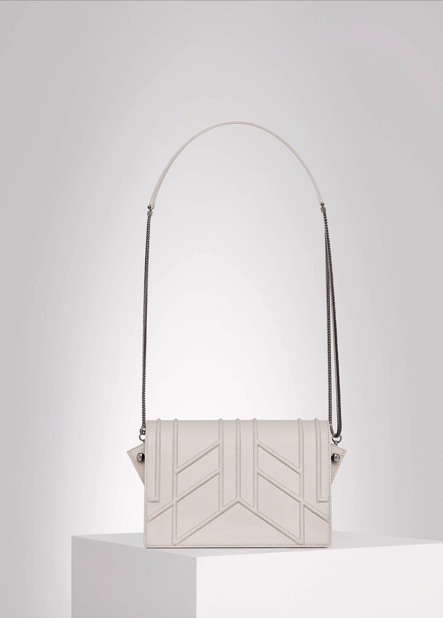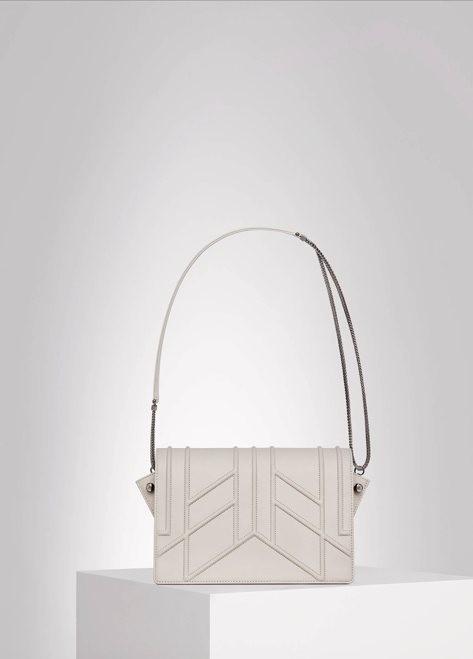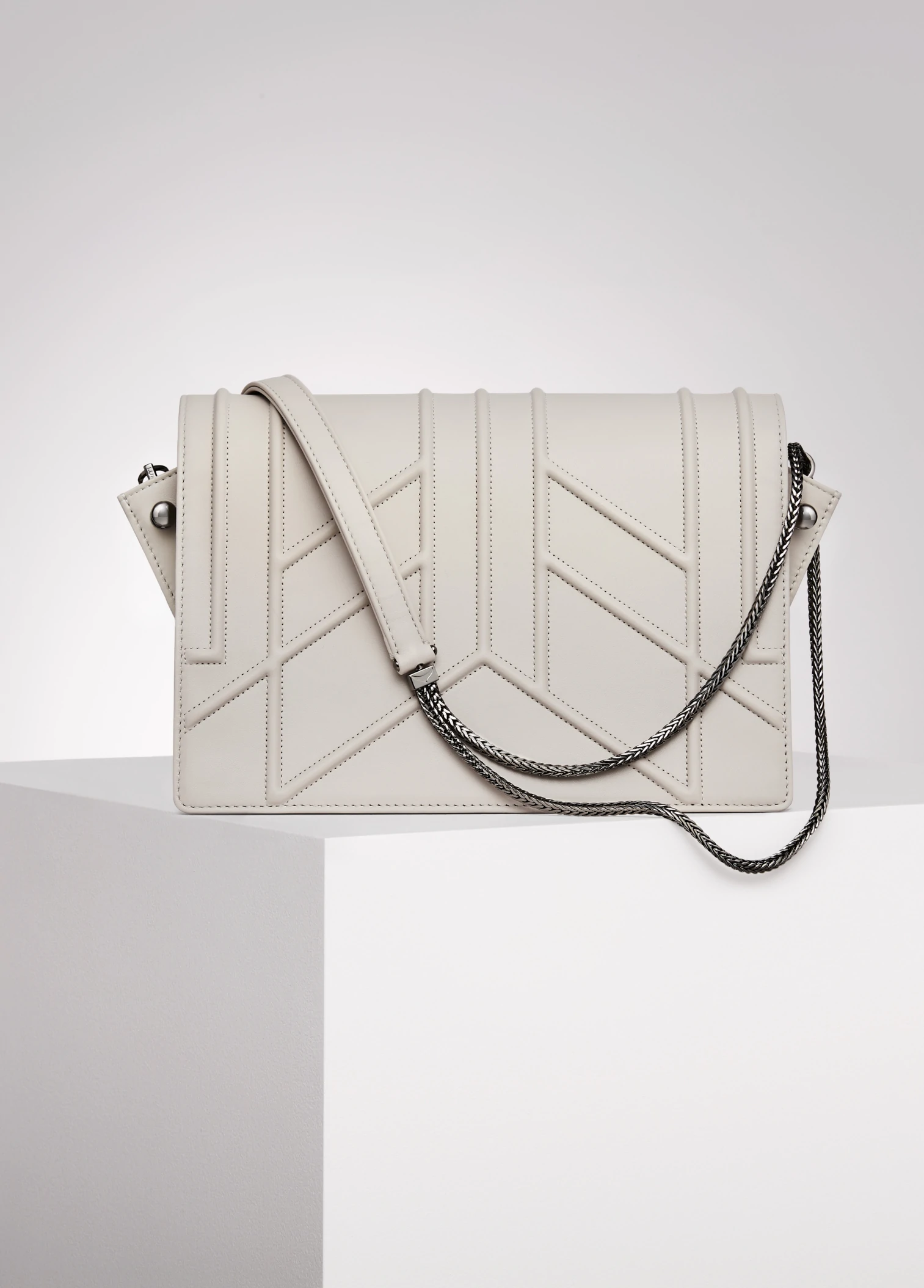 embroideries, stone colour lambskin, dark silver-tone brass chain