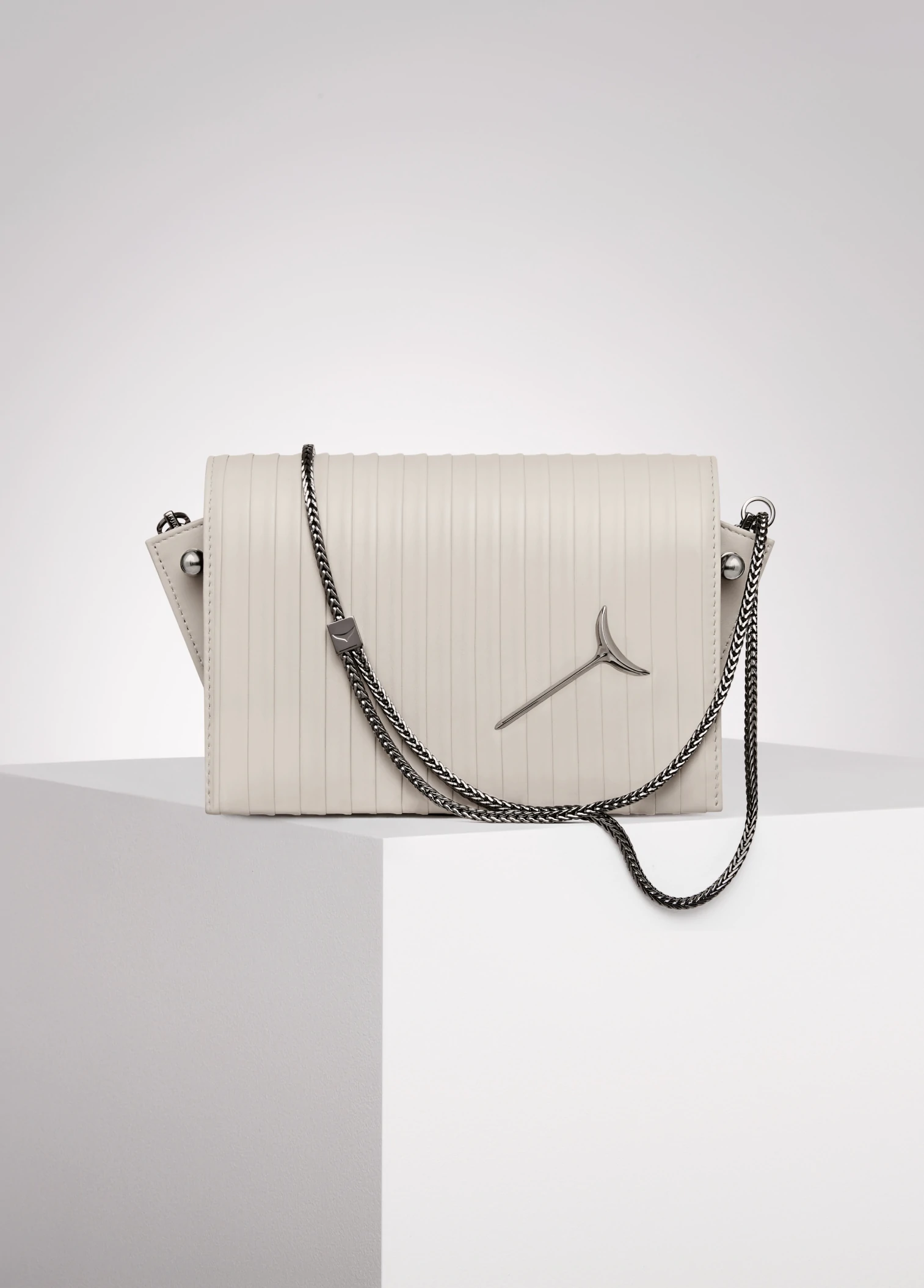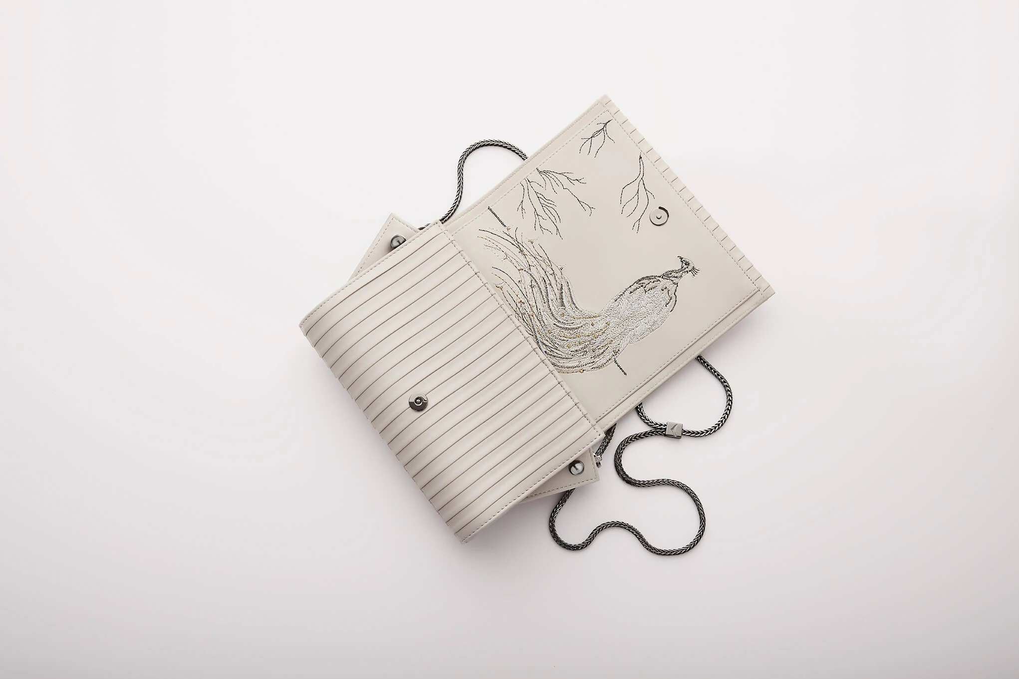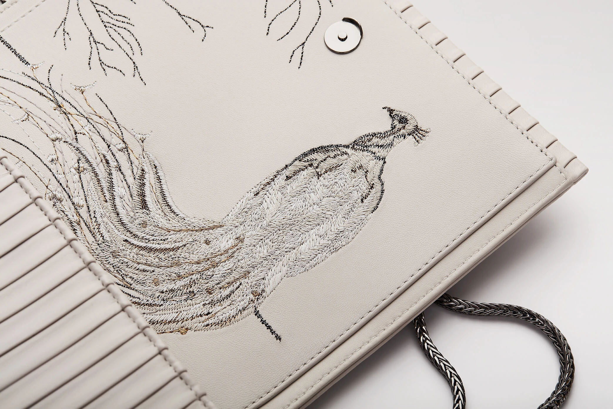 Entirely crafted from smooth velvety lambskin leather. Pleated leather envelops the exterior with a pin as an interpretation of a tip of a peacock's feather. “White peacock” layered embroidery, enhanced by dark silver and gold threads. Created on a leather placed inside the bag. Each work has unique number engraved inside.