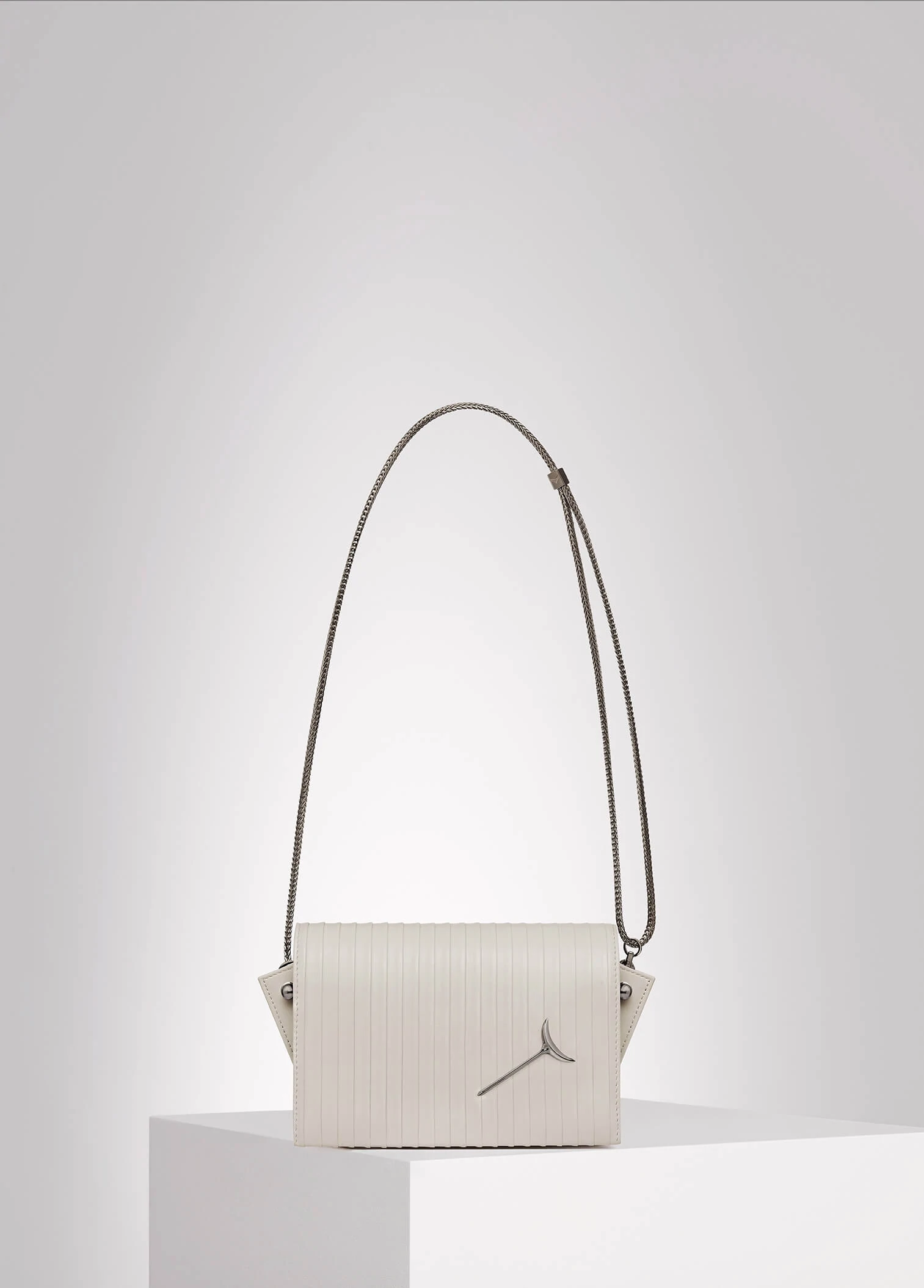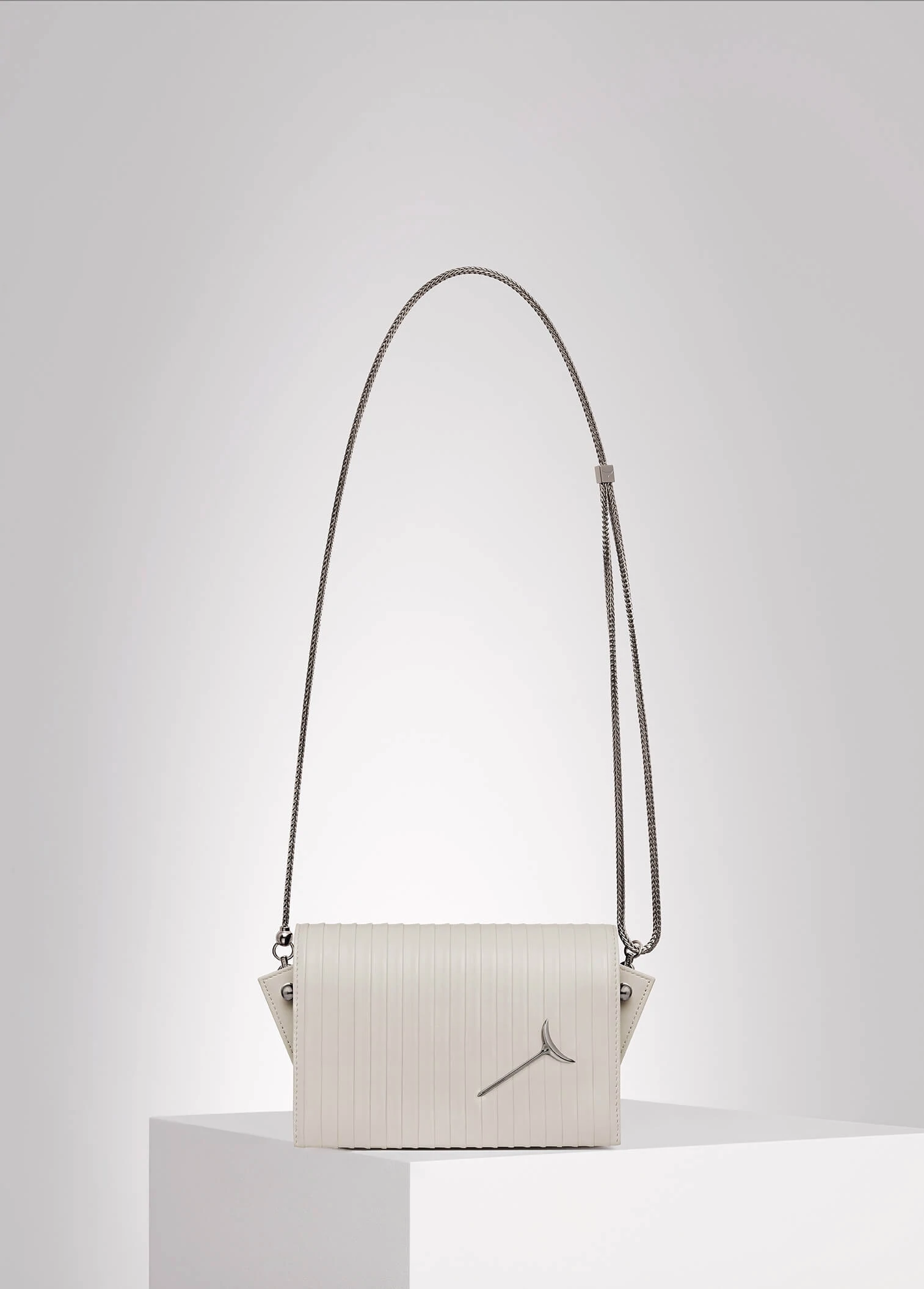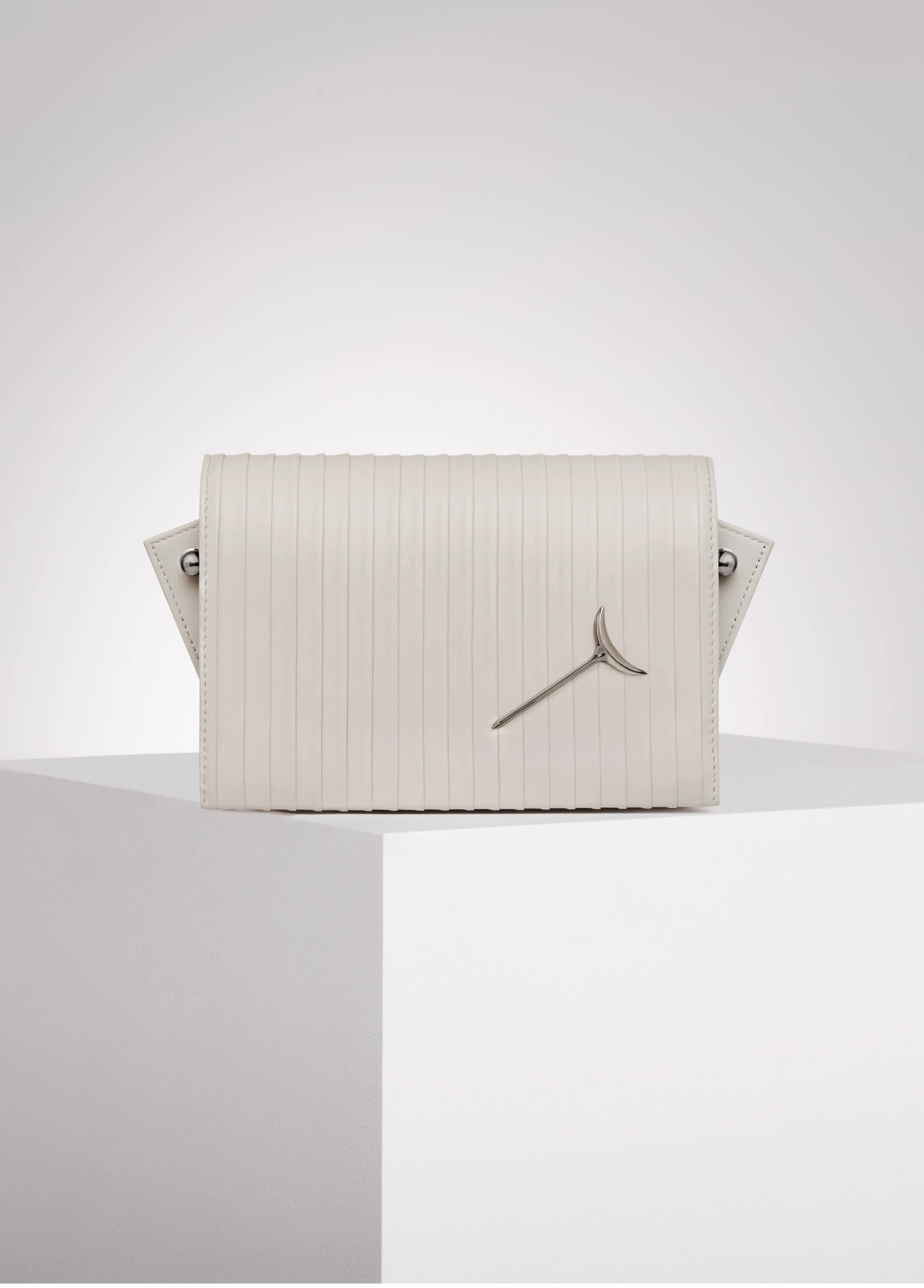 Entirely crafted from smooth velvety lambskin leather. Pleated leather envelops the exterior with a pin as an interpretation of a tip of a peacock's feather. “White peacock” layered embroidery, enhanced by dark silver and gold threads. Created on a leather placed inside the bag. Each work has unique number engraved inside.